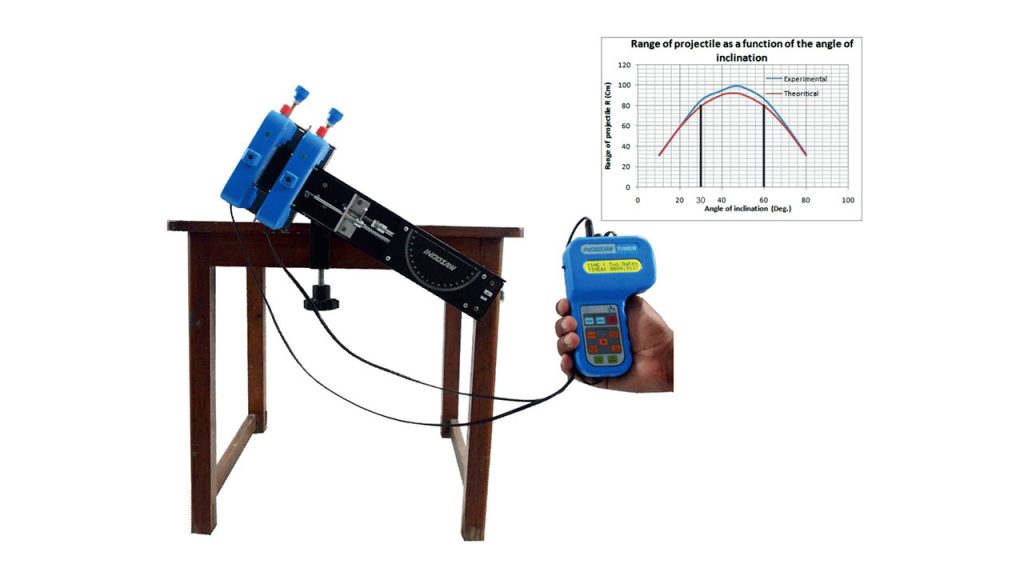 Projectile motion is used to experimentally determine the trajectory of a projectile launched either horizontally or at an angle. Angles between 0° and 90° can be selected. By varying the tension in the spring, different launch velocities can also be achieved. In this setup, the horizontal range and maximum height of the projectile can be measured using a marked surface. By analyzing the time of flight and displacement, students can verify the theoretical equations of motion under gravity. This experiment helps in understanding the effect of initial velocity, launch angle, and gravitational acceleration on the path of a projectile.