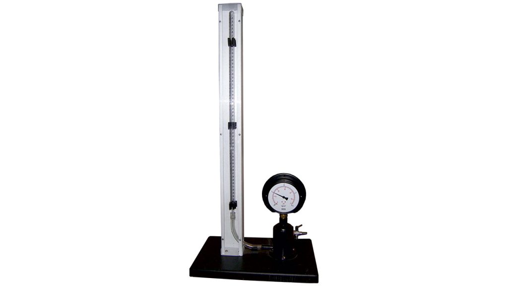 For demonstrating the Boyle’s law. The apparatus consists of a wide bore strong glass tube mounted in vertical position in front of scale graduated 0-65 cm3. A bourdon gauge is provided for measurement of pressure. The gauge is fitted with a pressure chamber which contains coloured oil (supplied in separate container). With the increase of pressure in the oil chamber, oil moves into the glass tube. Volume and actual pressure of the contained air can be read directly. The tube is covered with a rigid safety screen. The tube, bourdon gauge and safety screen are fixed on a base.